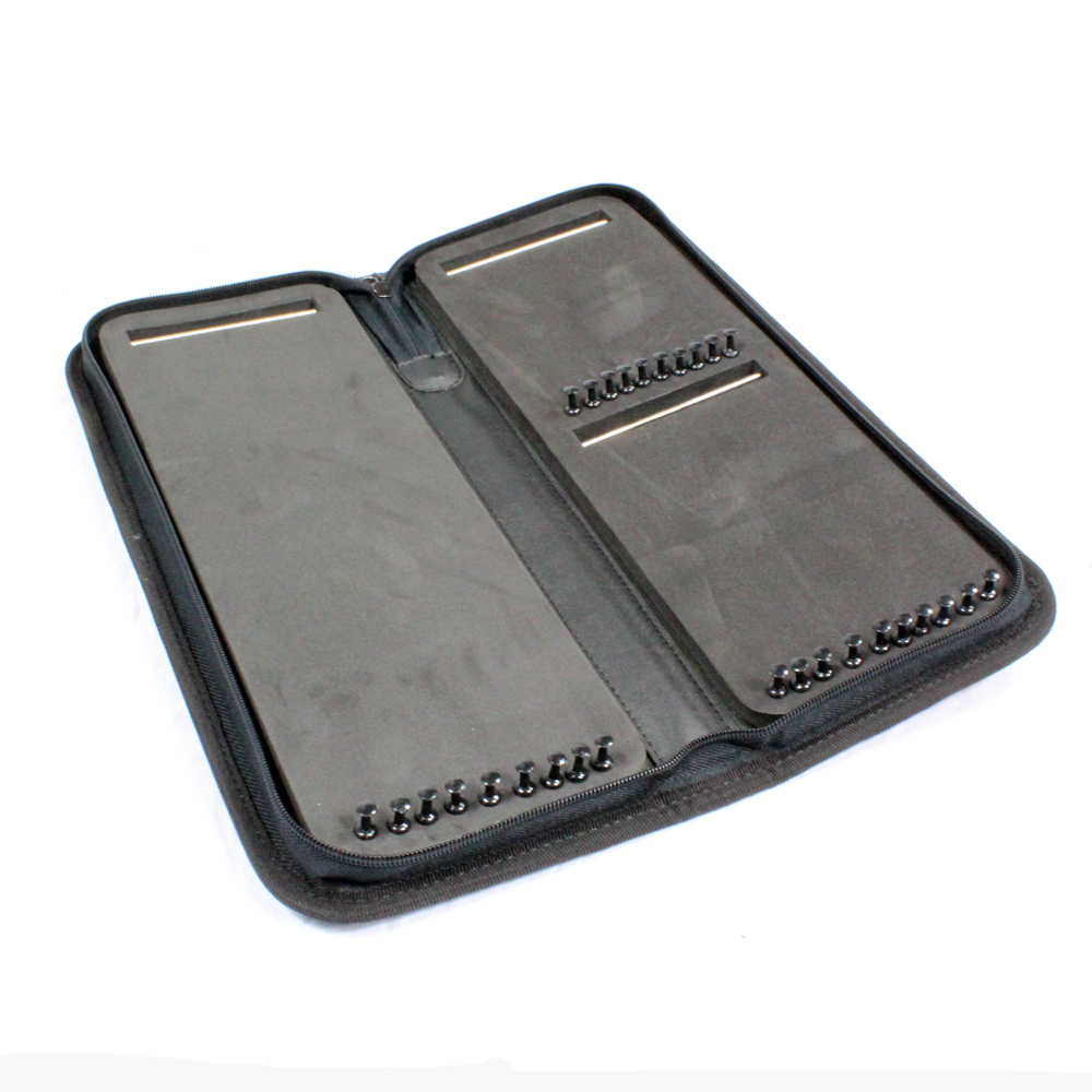 לקחתי סוג של "ארנק" כזה גדול לדיסקים, הוצאתי את כל הדיסקים וקראתי את הדפים, הדבקתי בשתי הצדדים סוג של ספוג שקוף כזה, ופשוט תוקע בו את הקרסים ולמטה שם נעץ ומחבר לנעץ את הקצה השני של הריג אם זה סביבל\סיכה או סתם לולאה  זה אחלה שיטה בדיוק כמו התיקי ריגים שמוכרים לדייג קרפיונים הזמנתי אחד כזה לא מזמן בקרוב יגיע